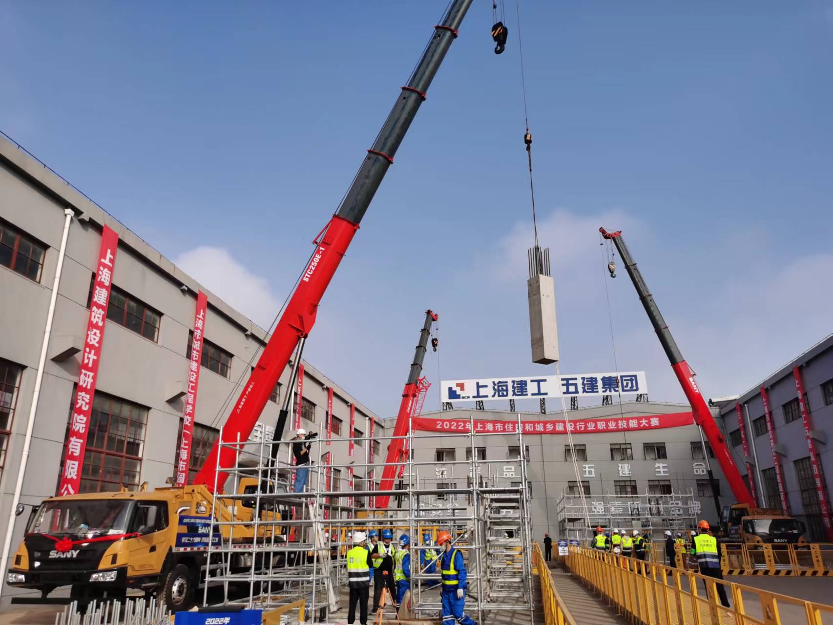 参加此项比赛的共9支队伍,每支队伍7人,其中3名辅助工,他们需要在4个小时内成功搭设一栋整体装配式框架结构的工法楼。选手们从构件吊装准备、引导就位到安装校正,有条不紊地操作着。一旁的3台三一起重机高举大臂,与他们紧密配合。