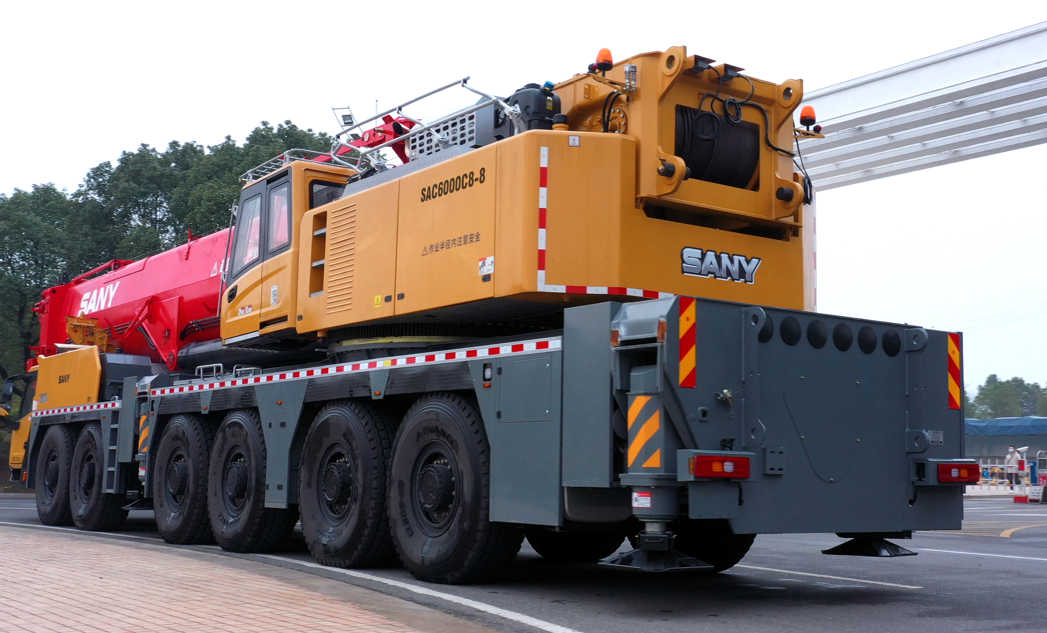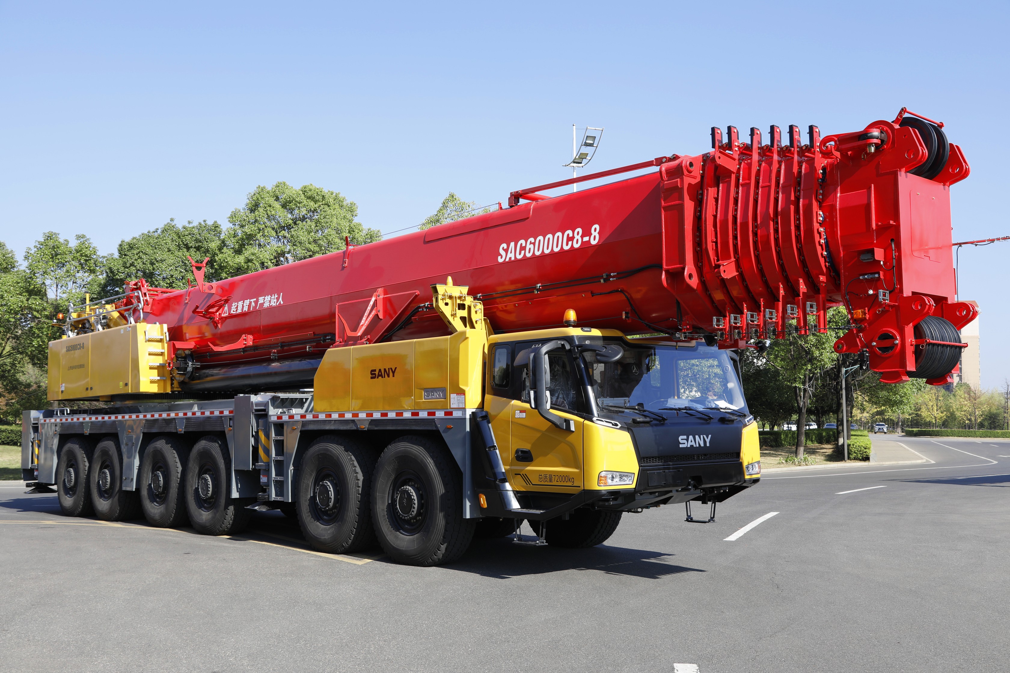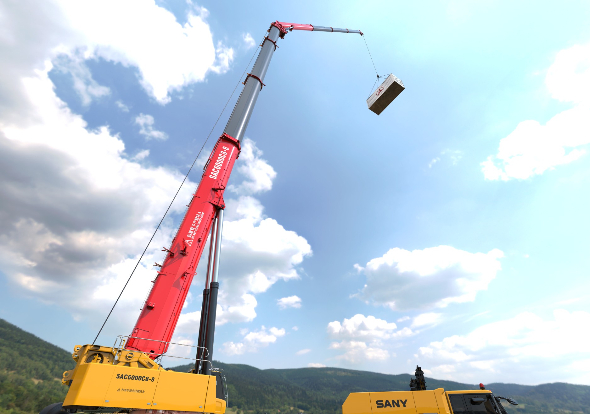 SAC6000C8-8最大起重力矩1500t·m,最长主臂95m,同吨级主臂截面最大。标配48m机械变幅副臂,选配60/66m液压变幅副臂,13.4/47m风电臂,36m箱型液压变幅副臂,最大起升高度144.5m。