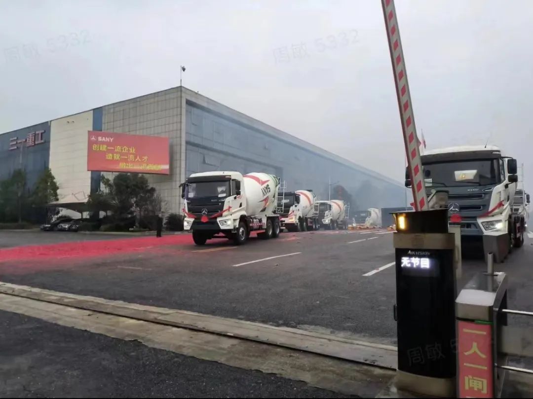 在邵阳产业园,88台三一搅拌车排列整齐,车队绵延,声势浩大,引来了不少行人驻足观看。
