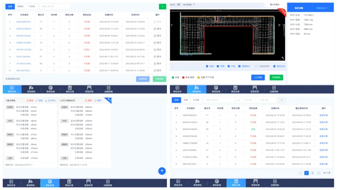 最后一个环节:边缘算法自动比对图纸数据和视觉数据,输出质检结果,以图形化的方式实时呈现平板上。信息包含隐检的图片、视觉结果、与图纸的对比结果。其中绿色线条表示合格,红色的表示缺失/多余,黄色的表示尺寸精度不满足质检标准。