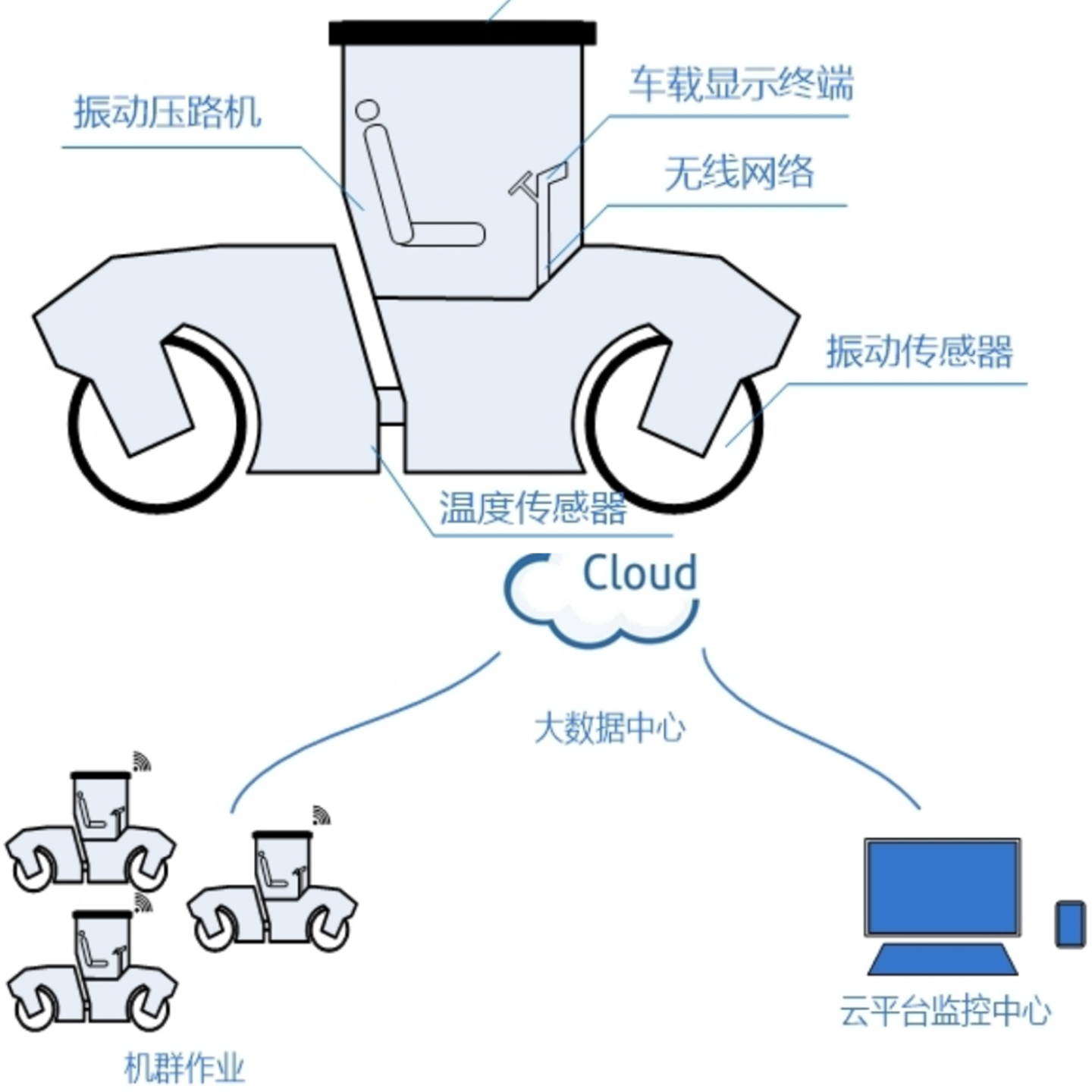 智能压实系统主要包括振动压路机、高精度定位天线、无线网络、车载显示终端、振动传感器、温度传感器和大数据云平台。