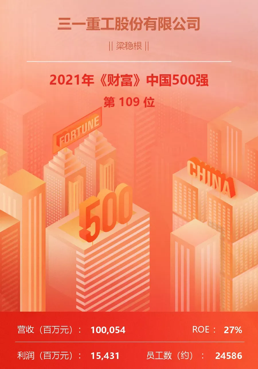 7 月 20 日,2021年《财富》中国500强排行榜揭榜,三一重工以1000.54亿元的营业总收入,位列榜单第109名,较上年度提升24个名次,连续十一年稳居工程机械制造行业第一。