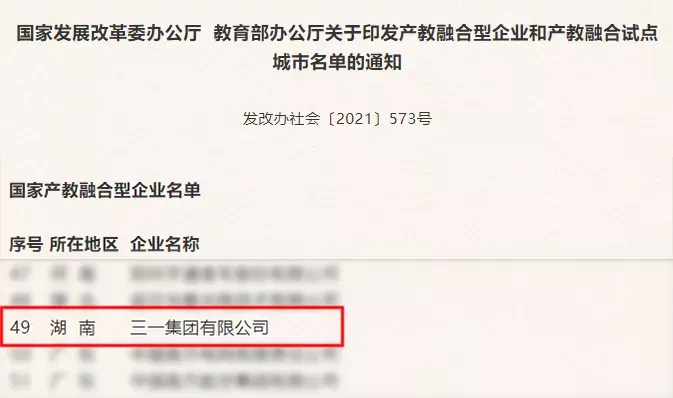 近日,国家发展改革委、教育部联合发布首批“国家产教融合型企业”名单。三一集团成功入选,是湖南省唯一入选企业,也是工程机械行业唯一入选企业。