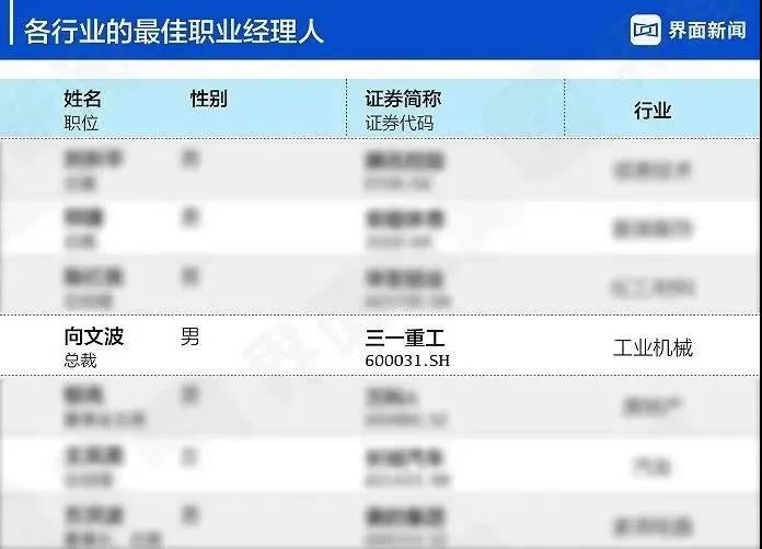 近日,界面新闻发布2021中国上市公司最佳职业经理人榜单,列出了50位优秀的职业经理人,三一重工总裁向文波榜上有名,位列第25,同时也是工程机械行业的最佳职业经理人。