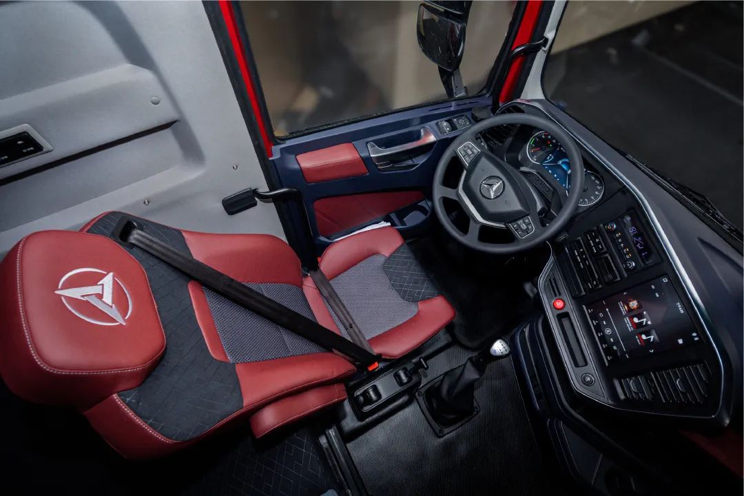 采用四点悬浮气囊结构,驾驶室NVH堪比高级轿车。豪华气囊减振座椅,隔振率超同配产品54.5%!可进行刚度、腰部、扶手等16个方向多重调节功能,给司机腰部更全面、舒适的承托。
