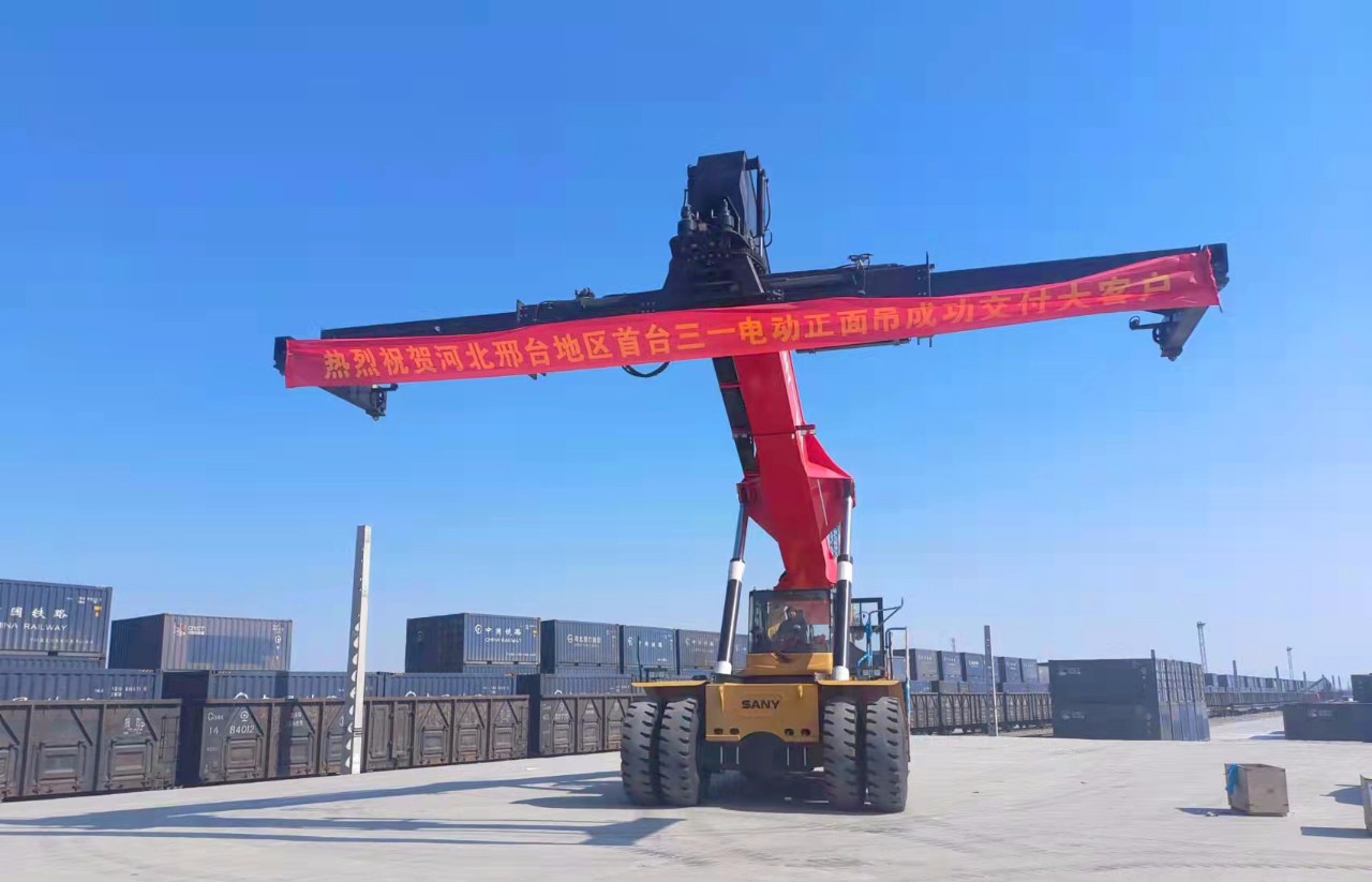 三一第二代混电正面吊SRSC45E2交付河北邢台客户投入使用,这是自去年7月和今年1月后,又一河北地区客户购入三一电动正面吊。