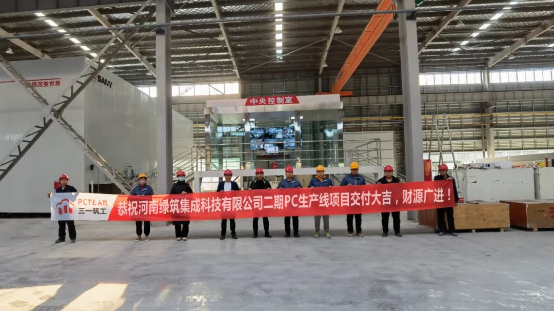 河南绿筑的第一条PC生产线已于2021年投产,加上本次投产的第二条PC生产线,年产能可达10万立方米。在三一专业安装队加班加点,兼顾质量保障的情况下,二期PC生产线设备进场安装至交付比原定周期缩短42%,安装效率创行业之最。在项目现场,三一筑工代表和河南绿筑客户代表双方拉起了“恭祝河南绿筑集成科技有限公司二期PC生产线项目交付大吉、财源广进”的横幅,并合影留念。