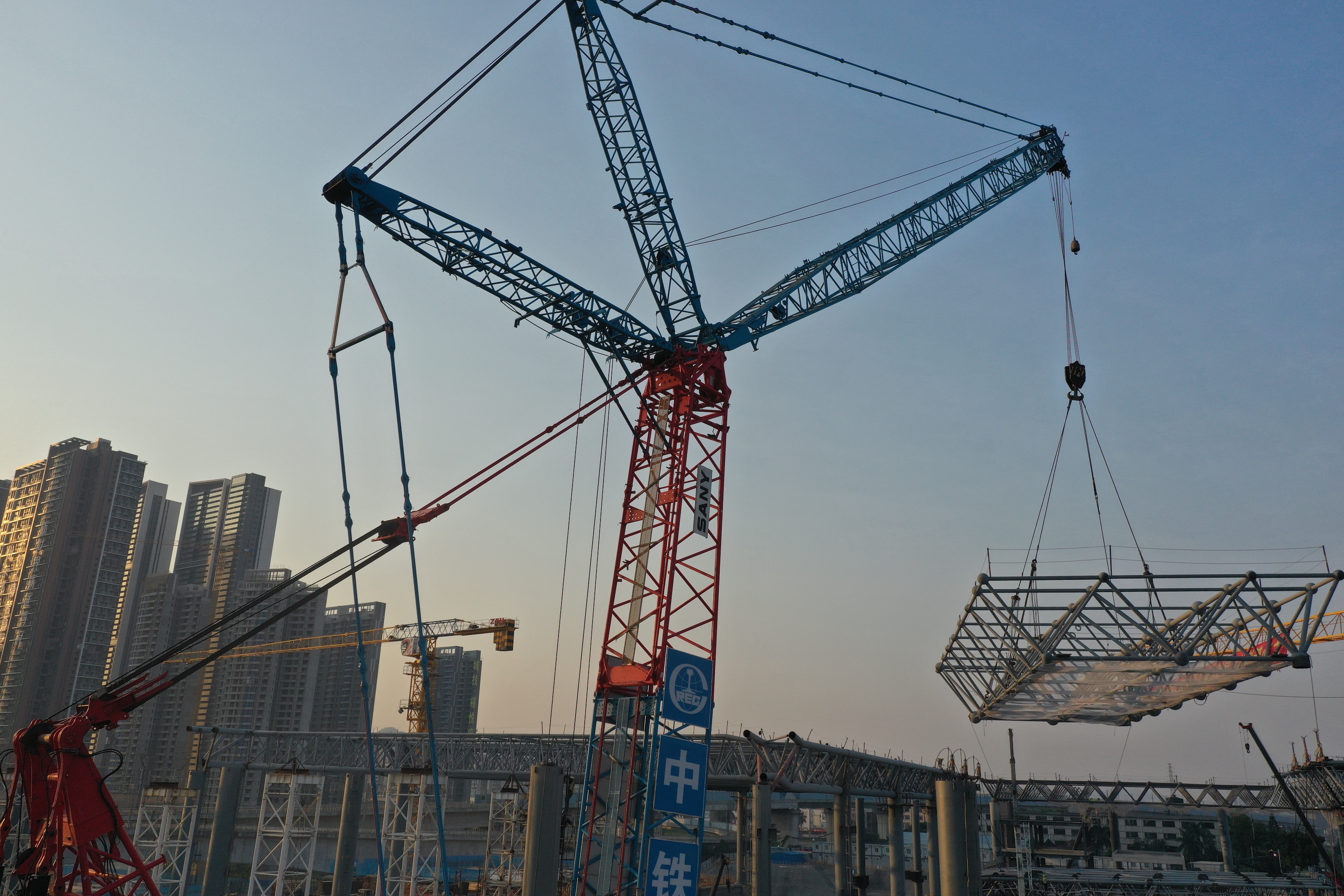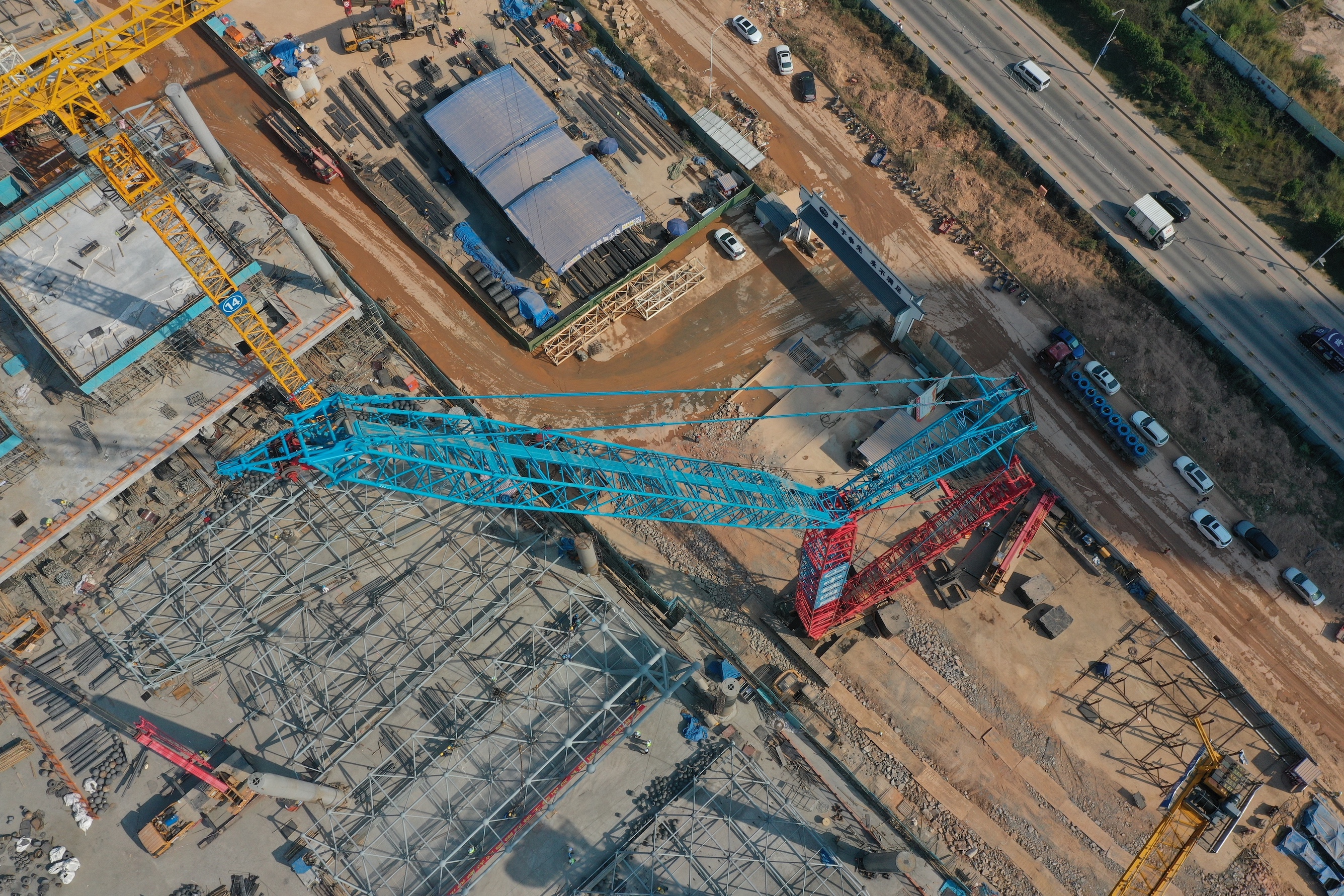 原来,这次安装的钢结构网架和平常的不一样,一是它非常大,长33.6m、宽12.75m、高3.8m,重量约为47吨,跟普通篮球场差不多。二是由于现场场地有限,吊装时需要将这顶“钢帽子”吊到20多米高的位置后,再带载行走40米才能到达指定位置。