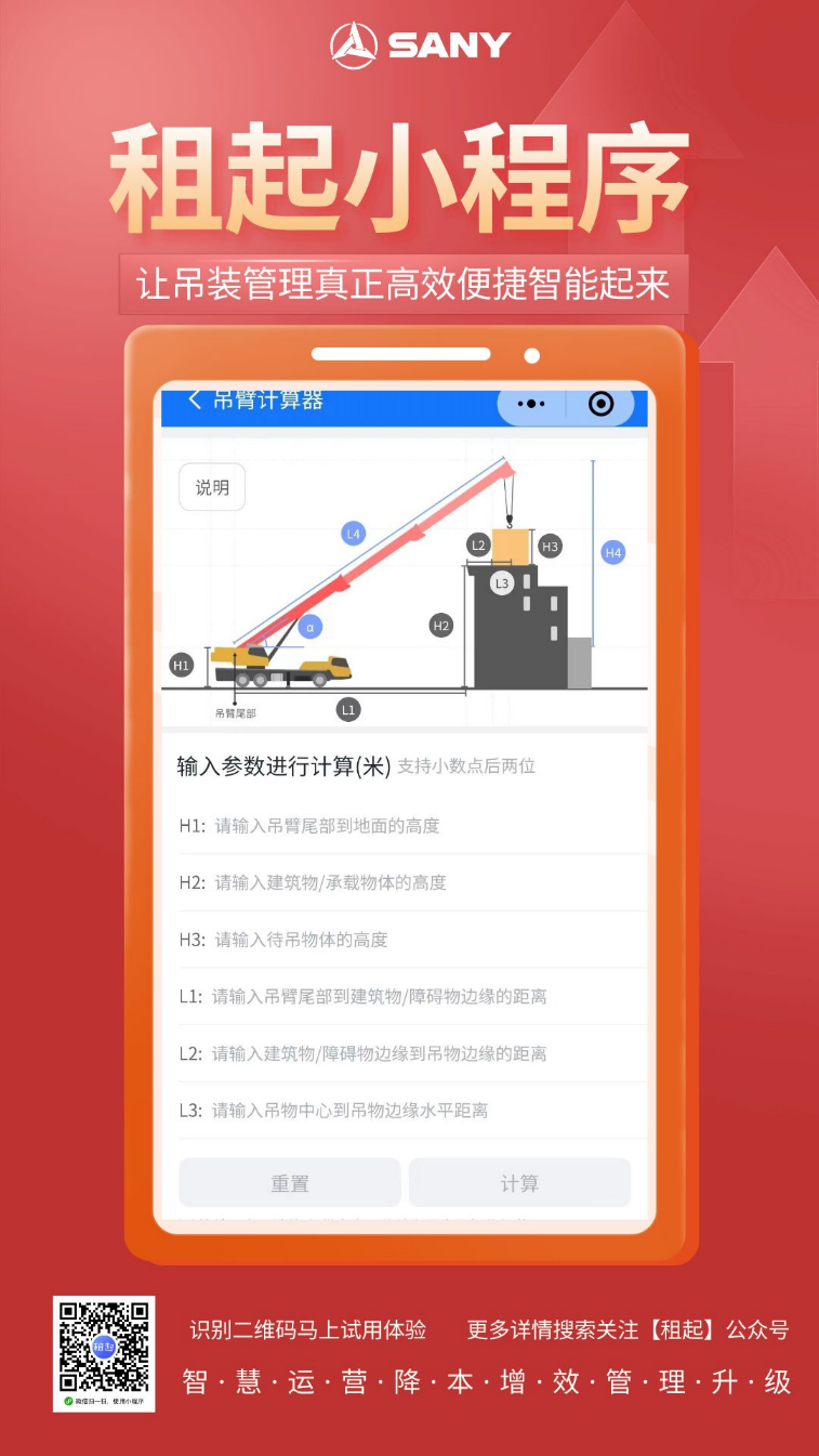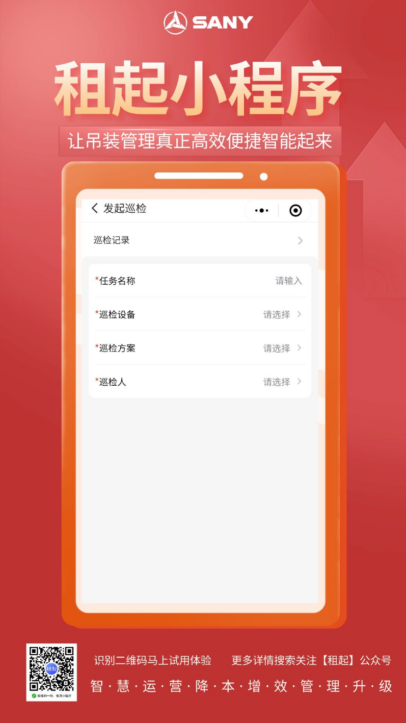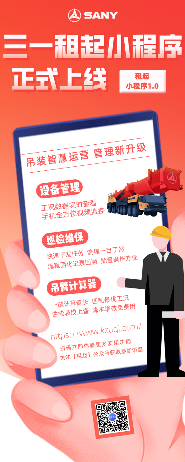 三一 “租起”微信小程序正式上线啦!1.0版本集合了设备管理、巡检管理、吊臂计算器三大实用王牌功能,致力于给吊友们提供更高效、更便捷的使用体验。