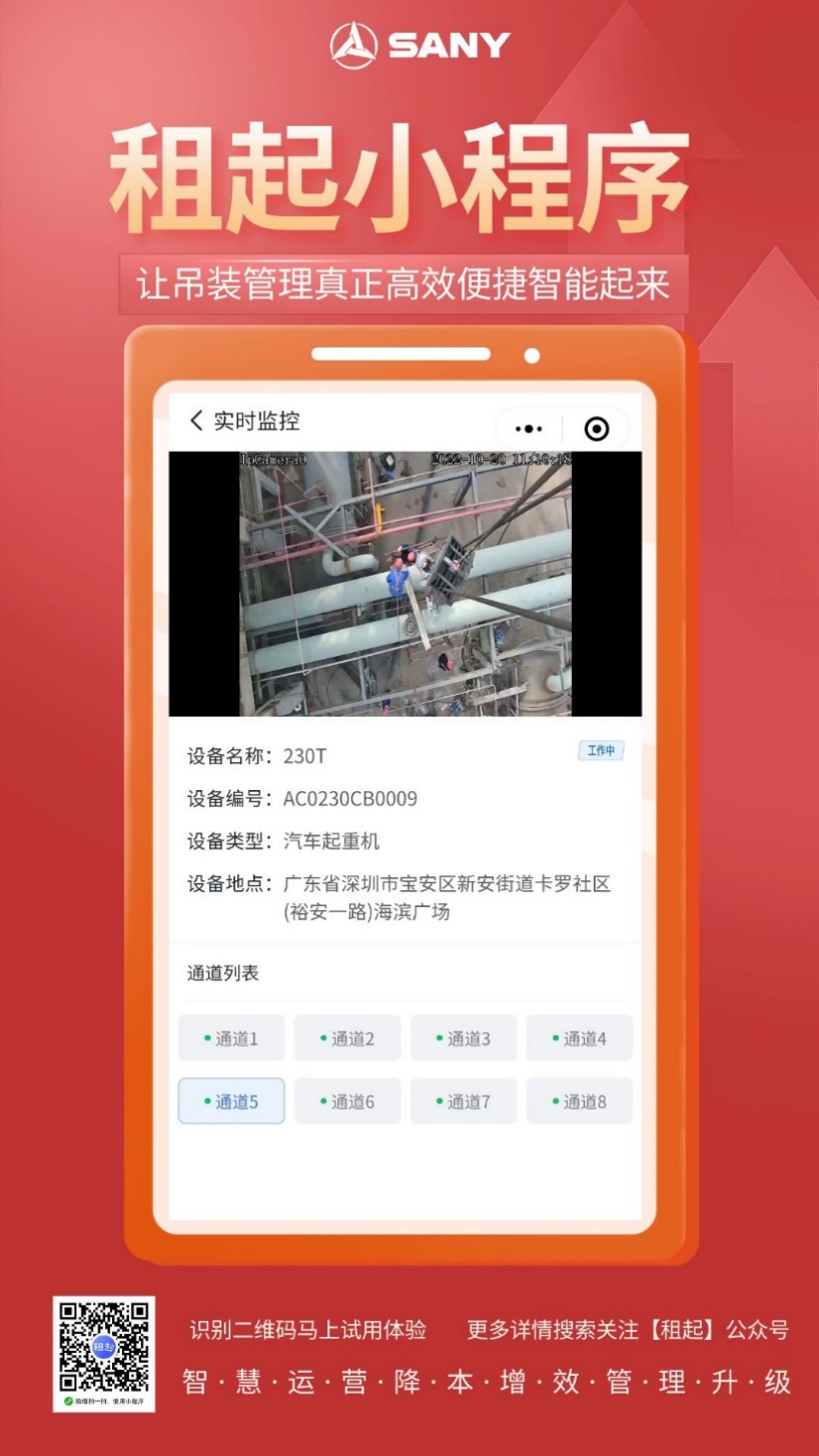 “租起”微信小程序支持远程实时视频查看,安全监管更主动高效。安全监察员打开应用便能了解施工现场的作业环境、关键部件状态和吊重物情况。