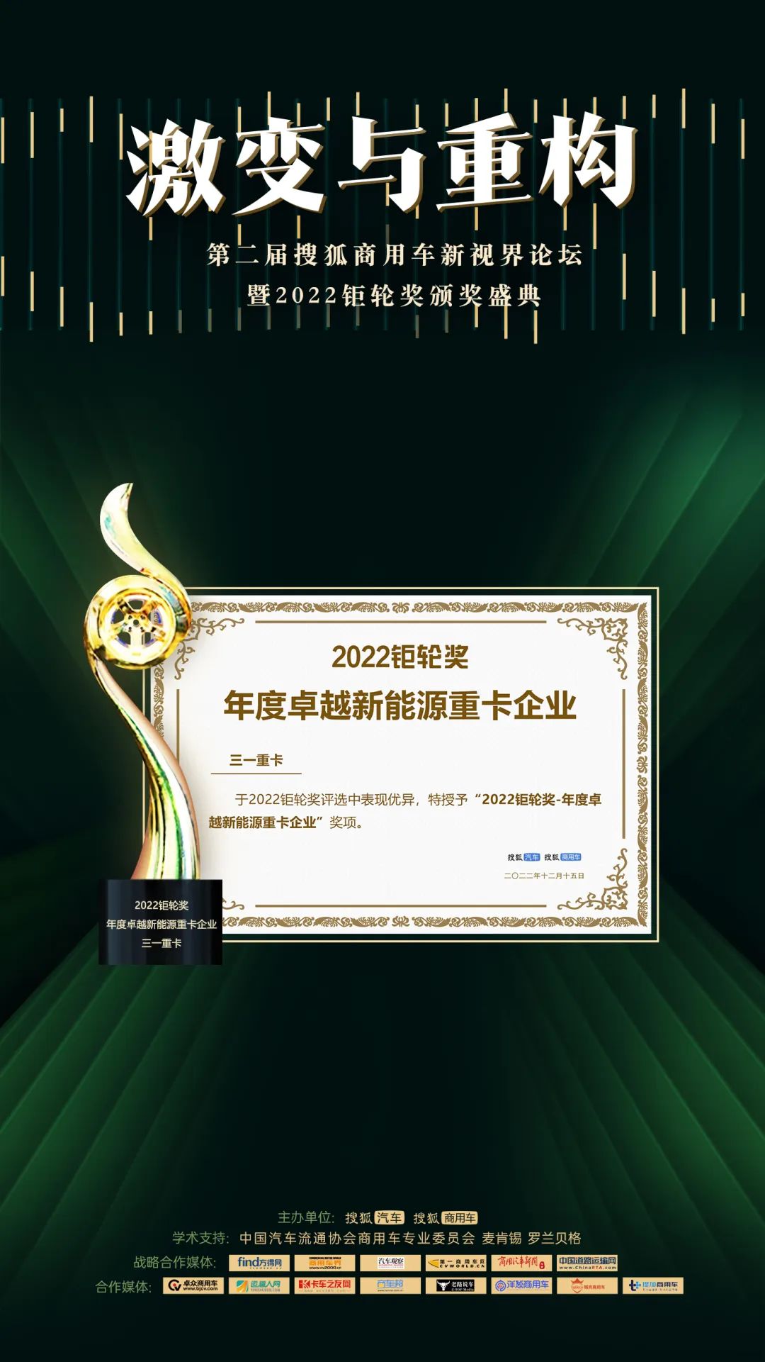 三一重卡凭借在新能源重卡领域的卓越表现,获专家团队一致认可,斩获“2022钜轮奖年度卓越新能源重卡企业”殊荣。