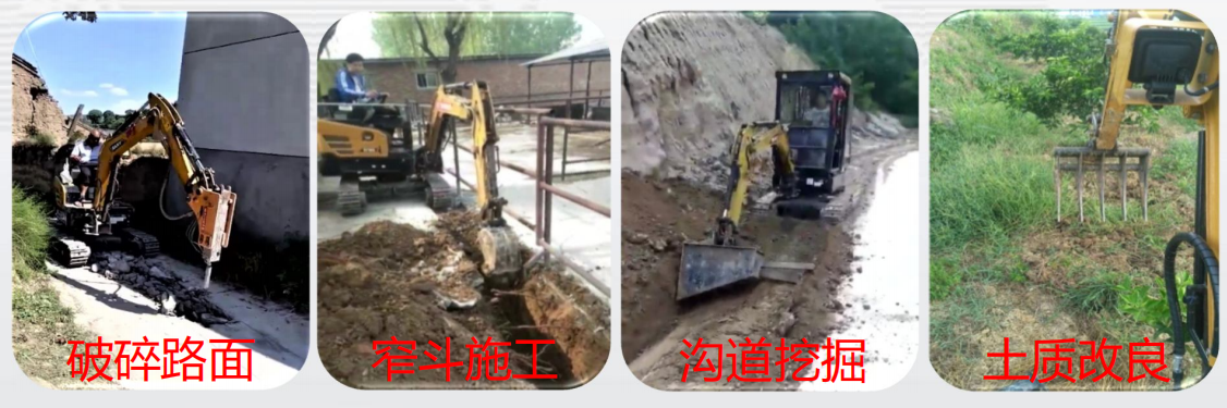 标配辅助管路和截止阀,可直接安装破碎锤等辅助工具,开发原配窄斗、宽斗、除草把等属具,不同工况,不同属具,效率更高。房屋改造、园林绿化、蔬菜大棚、沟道挖掘、土质改良,各种工程都能搞定。
