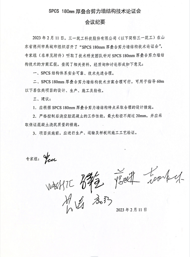 2023年2月11日,三一筑工科技股份有限公司在山东省德州市三一城建住工(禹城)装配式建筑产业园组织召开了SPCS 180mm厚叠合剪力墙结构技术论证会,并形成了重要结论。