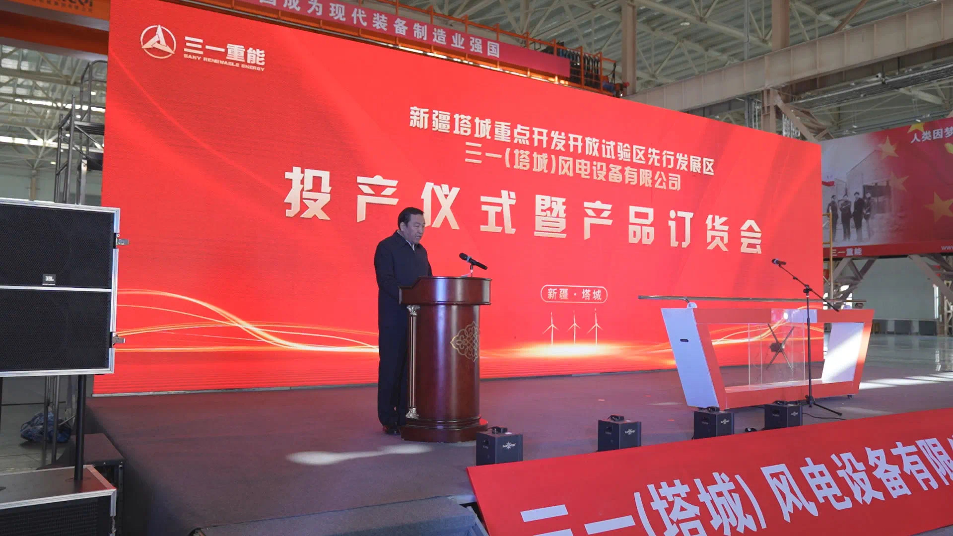 在投产仪式上,塔城地委副书记、行署专员阿依丁·托留汗表示,自新疆塔城重点开发开放试验区获批以来,党中央、自治区党委高度重视试验区建设,地委、行署不等不靠,先行先试,围绕自治区“八大产业集群”乘势而上,建设了50平方公里试验区先行发展区,全面启动了新能源创新产业园、国际物流园等45个重点项目。三一重能塔城制造基地项目是试验区引入的首批项目之一,项目建成投产,既是三一重能值得庆贺的一件大事,更是新疆塔城重点开发开放试验区建设发展的重要里程碑。
