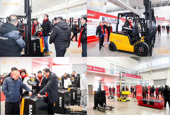 产品展示区,近距离感受此次大会发布的新品“双子星”SCP25C6平衡重电动叉车、SCD16锂电托盘堆垛叉车以及平衡重叉车、仓储车、无人物流AGV等全谱系产品,现场合作伙伴试乘试驾,亲身感受产品,现场演示远程锁车、解锁等智能管理平台,全方位展示三一产品的高智能、高安全、高可靠。