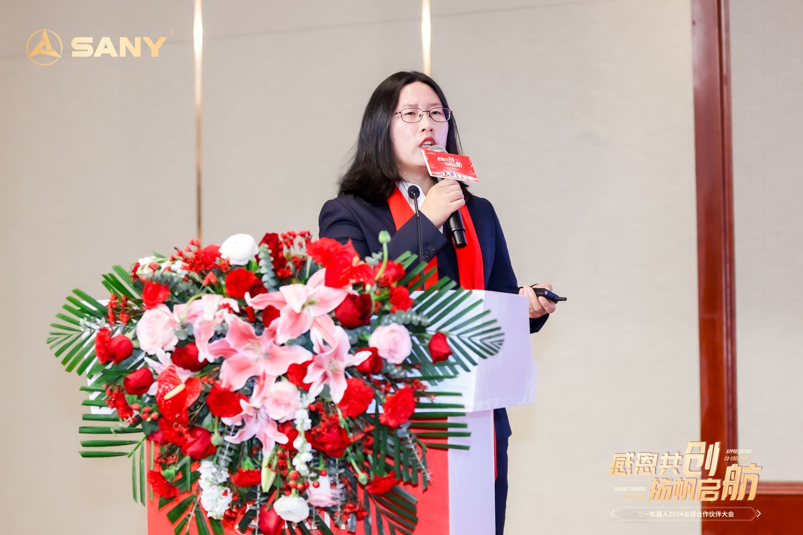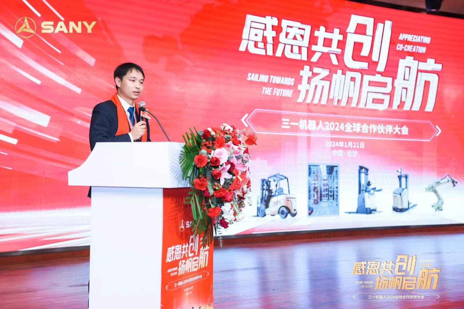 三一机器人科技有限公司副总经理、营销服务总监胡柱做三一机器人公司整体业务发展报告。在过去的一年中,三一机器人稳步推进海内外产业布局,市场营收超十亿元,外部销售占比超50%,在智能仓储、物流、智慧工厂等领域不断取得新的突破,品牌影响力再上新台阶。2024年,三一机器人将继续秉承“利他、创新引领”等核心价值观,坚持价值营销,携手合作伙伴共创美好未来。