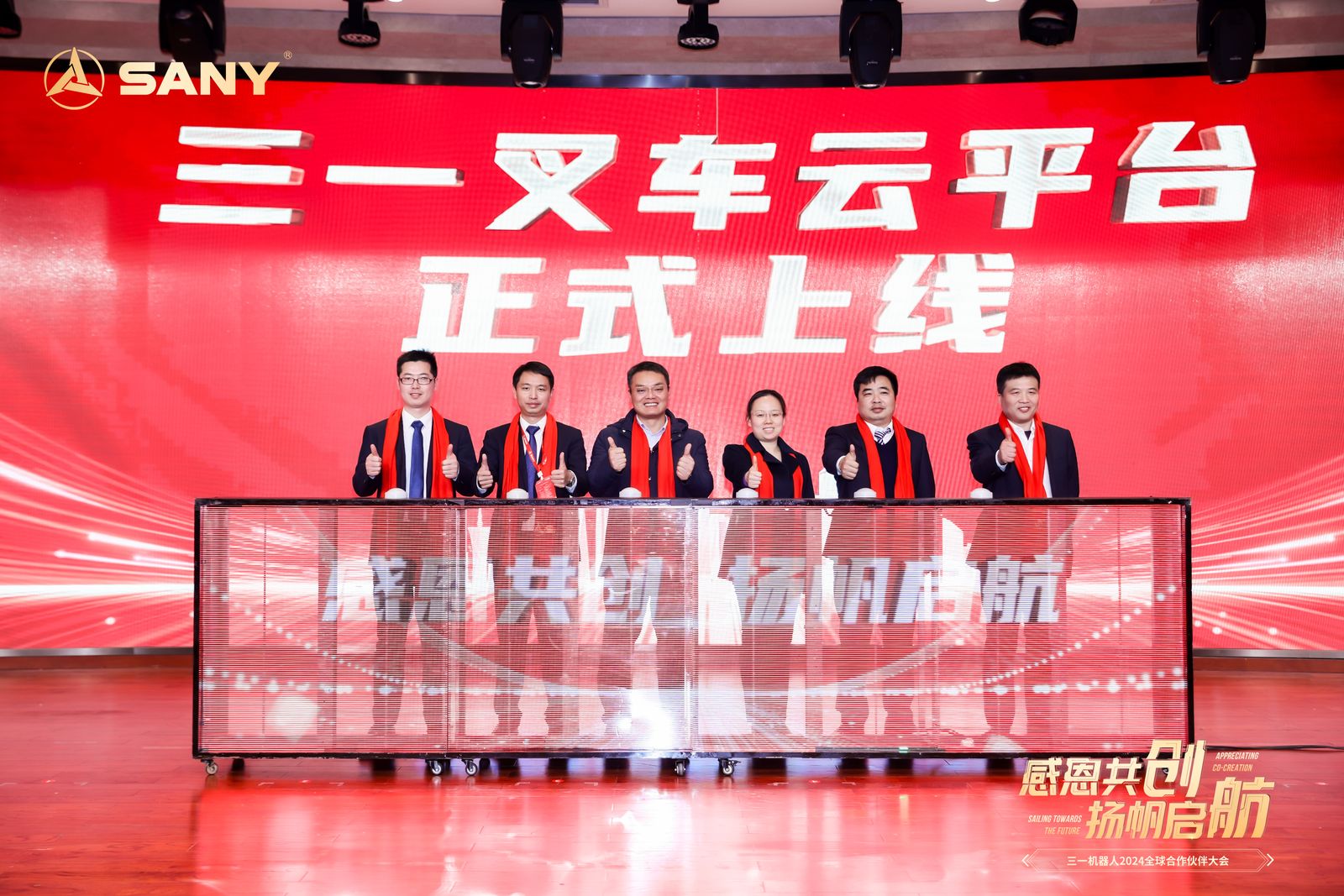 三一电动叉车智能云平台上线仪式同期举行,三一机器人副总经理胡柱、AGV研究院院长翁艳、武汉动力电池再生技术有限公司董事长张宇平、三一机器人电动叉车营销总监邹传林、电动叉车研究所所长魏晓晓、电动叉车研究所所长李红雨上台共同见证荣耀时刻。