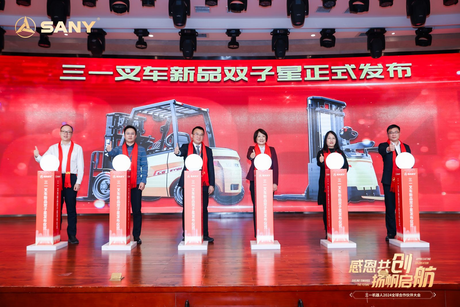 新品双子星正式发布,三一集团副总经理、三一机器人科技有限公司董事长郭承志,中国工程机械工业协会工业车辆分会秘书长张洁,中国移动机器人产业联盟秘书长李进科,中国仓储与物流运输协会秘书长郁士美,三一机器人科技有限公司总经理吴名陵,三一机器人科技有限公司副总经理、电动叉车项目总经理冯振礼共同按下启动键,三一新品双子星正式发布。