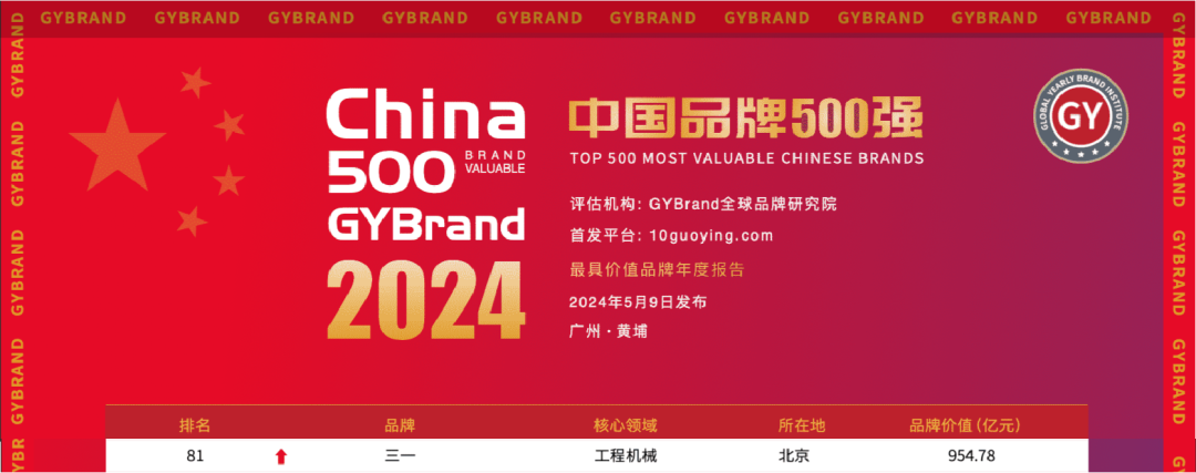 5月9日,GYBrand全球品牌研究院独家编制的2024年度《中国最具价值品牌500强》研究报告重磅发布。三一以954.78亿元的品牌价值位居第81位,排名创新高,在中国工程机械行业中断层第一。