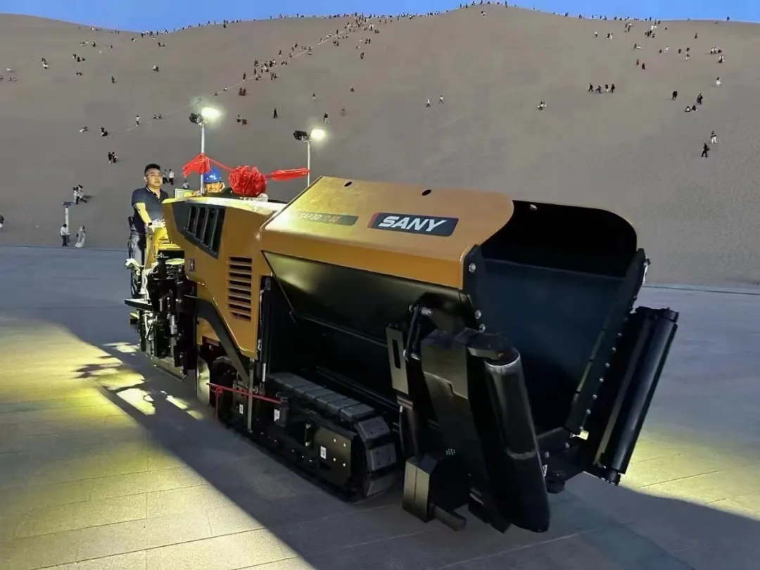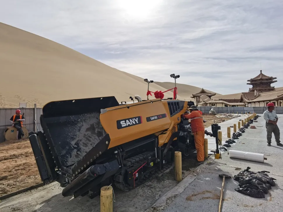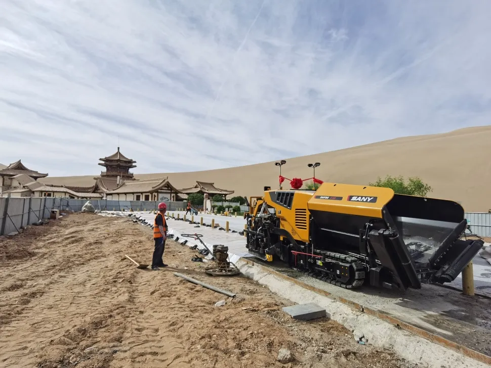 “大漠孤烟直,长河落日圆”,自旭日初升至星辉点点,三一SAP30C-10摊铺机便如同一位匠人,轰鸣着在月牙泉边的道路旁缓缓前行,为这片古老而神秘的土地抹上一抹现代色彩。