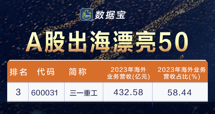近日,证券时报·数据宝发布“A股出海漂亮50”榜单,三一重工高位上榜,排名第三,同时排名工程机械行业第一。