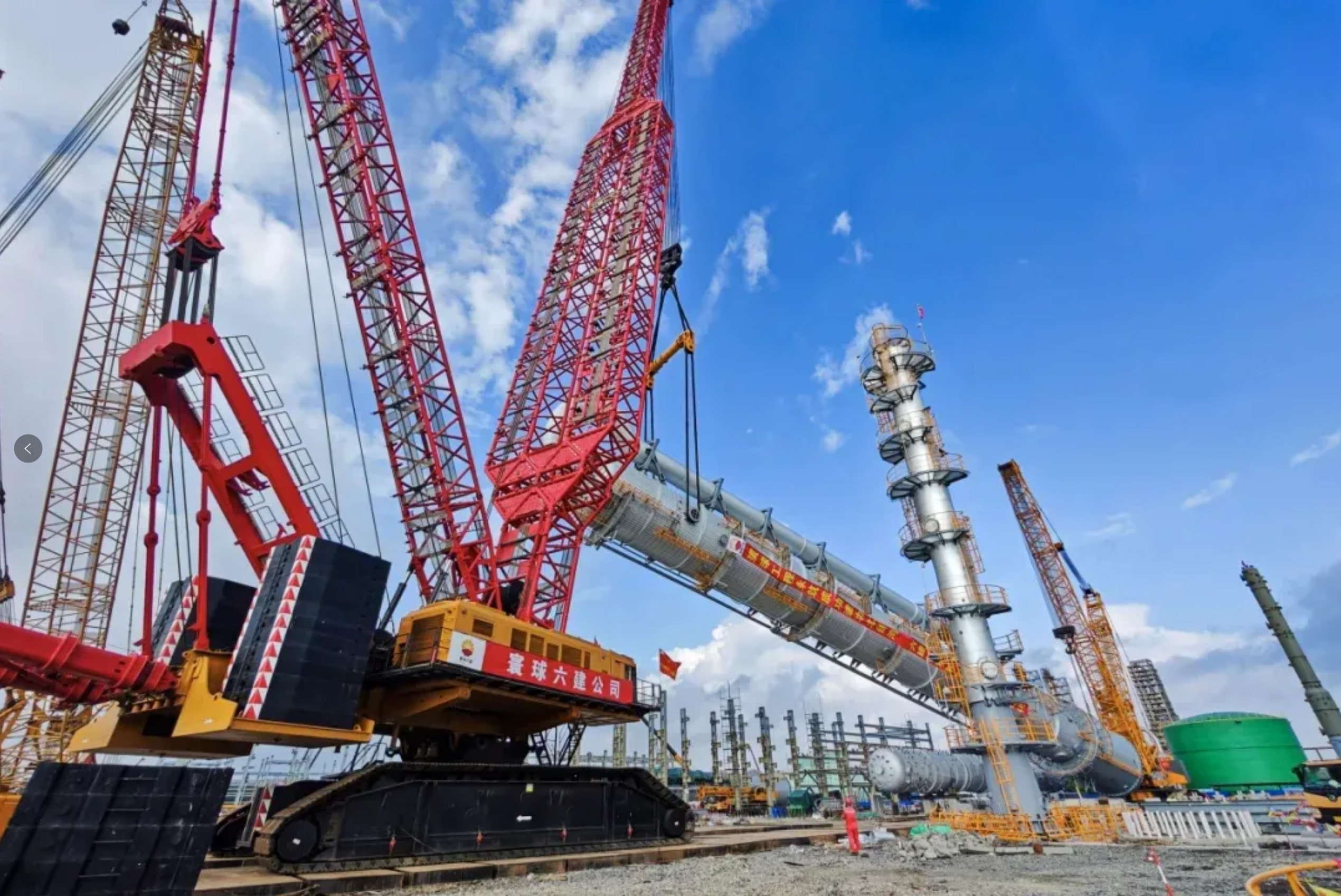 7月9日,广西石化炼化一体化POSM项目现场,中油六建SCC20000A 2000吨履带式起重机顺利完成该项目第四台特大型塔器——C-0270二级提浓塔的吊装任务。