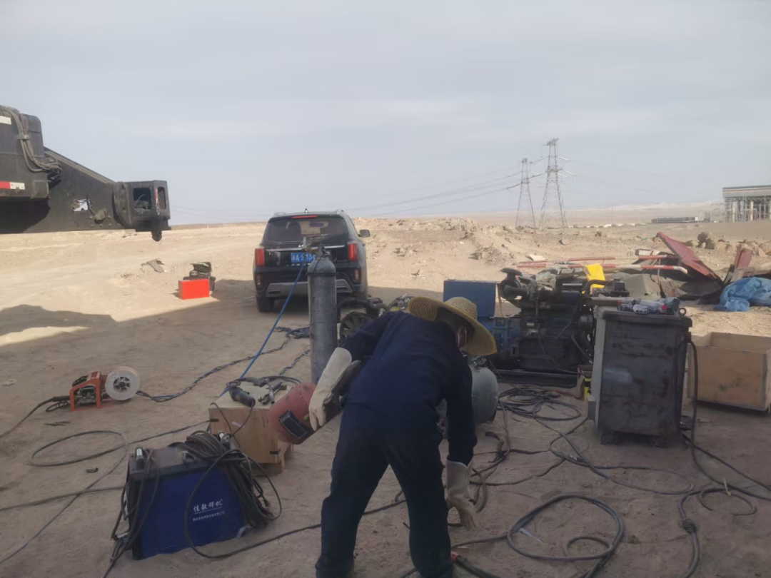 姜景森没有丝毫犹豫,马上驾驶服务车辆,穿越漫天黄沙,8小时后抵达客户所在地。在发现修复故障需要进行现场焊接后,姜景森顾不上休息,又往返80公里外的村镇拉来焊接设备,在一望无际的沙地上生生建起了一座电焊小铺,当天就完成了维修工作。
