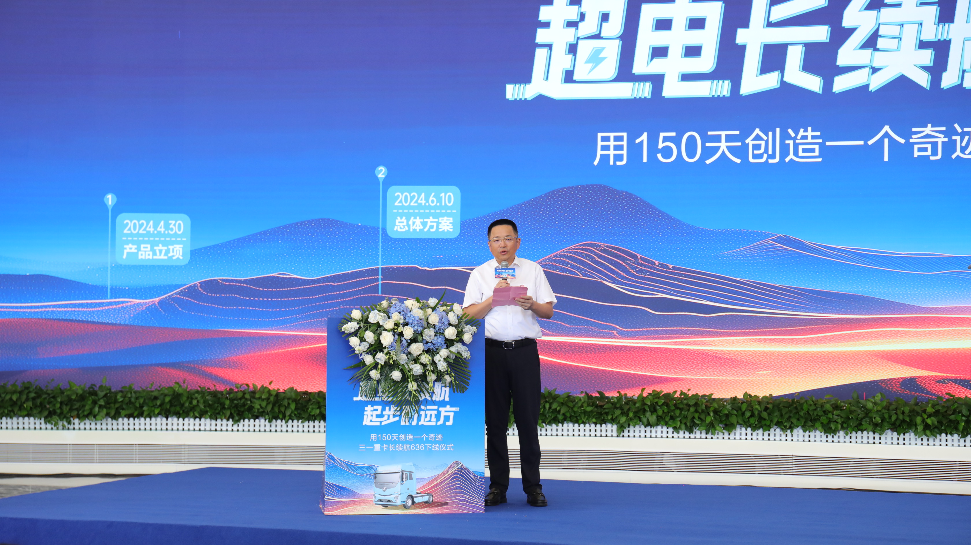 庆典伊始,三一集团董事、三一重卡董事长梁林河先生致辞,他表示江山SE636的发布离不开所有合作伙伴的努力,用150天创造了一个奇迹,让行业见证“电量王者”的诞生。
