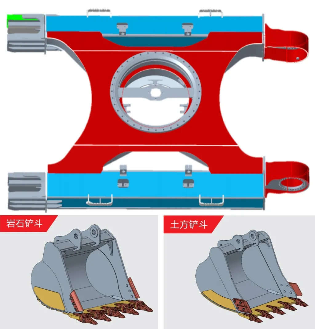 工作装置材料采用高强钢板+高强锻件+耐磨钢,铸造一体式连杆,可靠性强,结构件使用多体动力学CAE解析及疲劳仿真优化设计,提升工作装置寿命。加强型四轮一带,保证恶劣环境下行走装置强度。