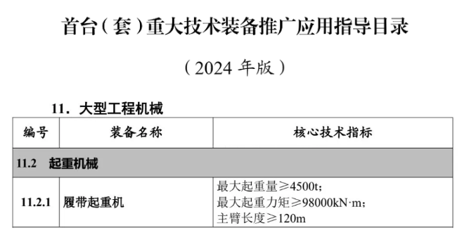 近日,工业和信息化部印发《首台(套)重大技术装备推广应用指导目录(2024年版)》(以下简称《指导目录》),在“大型工程机械”类别下,三一自主研发的4500吨履带起重机入选。