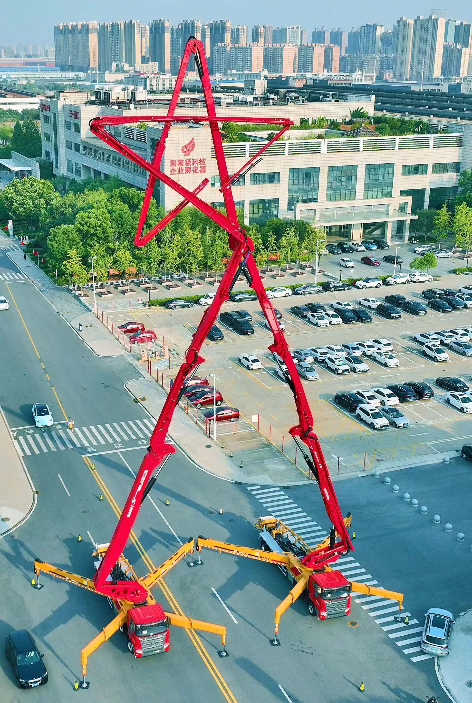 2024年10月1日,长沙县三一重工星沙园区,由两台三一泵车长臂摆出的巨型创意“五角星”造型亮相,营造出浓厚的节日氛围,庆祝新中国成立75周年。