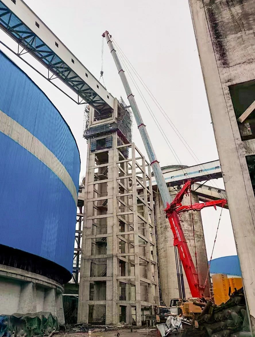 >>> 单机吊装,独当一面 在甘肃酒泉市瓜州常乐电厂,采用68.2米主臂,93吨配重,将重达82吨钢构轻松吊装到指定位置。