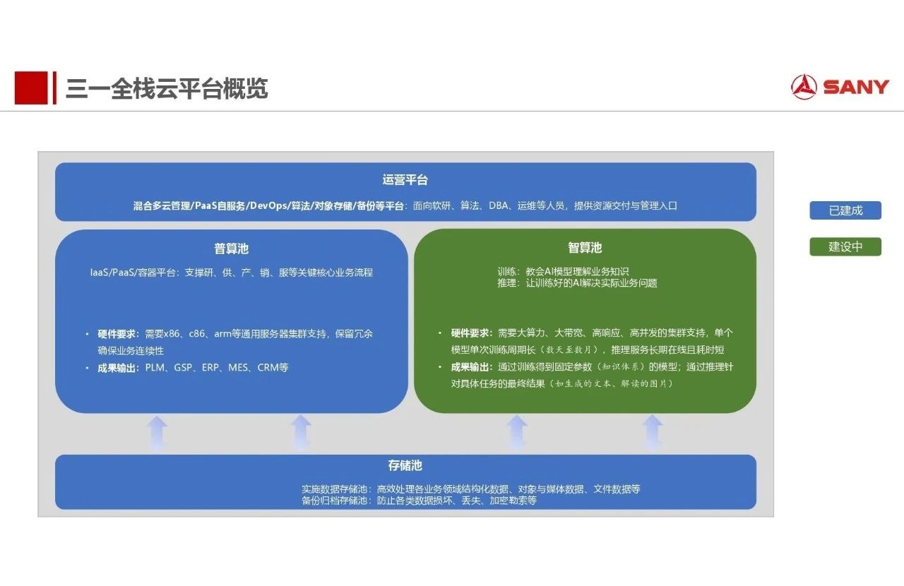 三一集团全栈云平台总投资3850万元,通过统一调度和管理跨地域、多品牌的服务器及存储设备,构建了包括运营平台、普算池、智算池、存储池四大模块的数字化基座,为企业研、产、供、销、服全产业链核心业务提供坚实支撑。