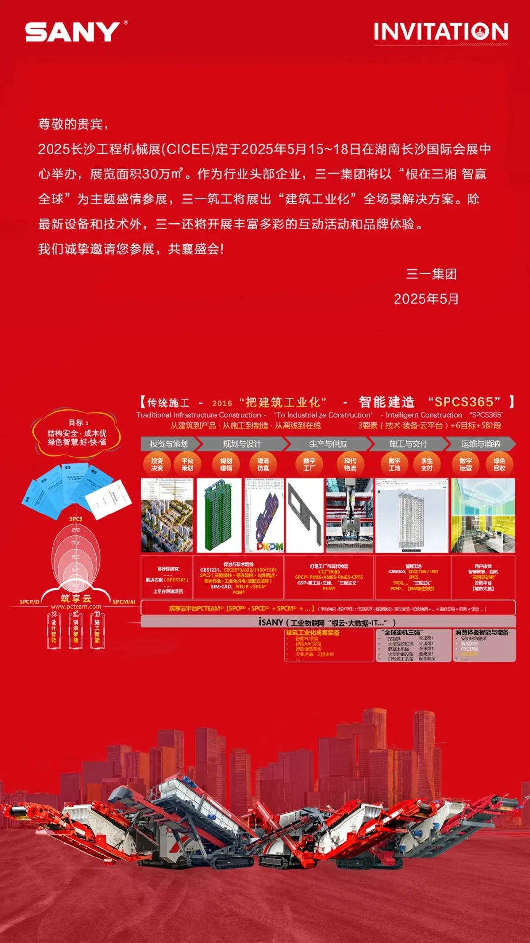 2025长沙工程机械展(CICEE)定于2025年5月15~18日在湖南长沙国际会展中心举办,展览面积30万㎡。作为行业头部企业,三一集团将以“根在三湘 智赢全球”为主题盛情参展,三一筑工将展出“建筑工业化”全场景解决方案及绿色破碎回收装备。