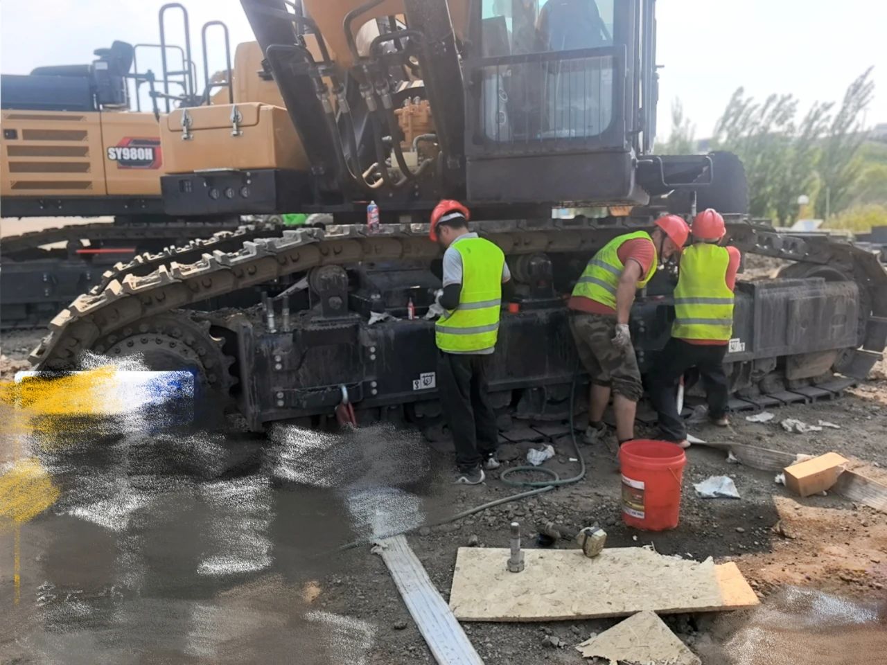 到达现场后,三一服务团队发现由于设备在前期拆解运输过程中受损,4台挖掘机底盘近200个固定螺丝孔出现大面积损伤,必须全部修复才能进行组装。这一意外情况使原本紧张的工期面临更大挑战。
