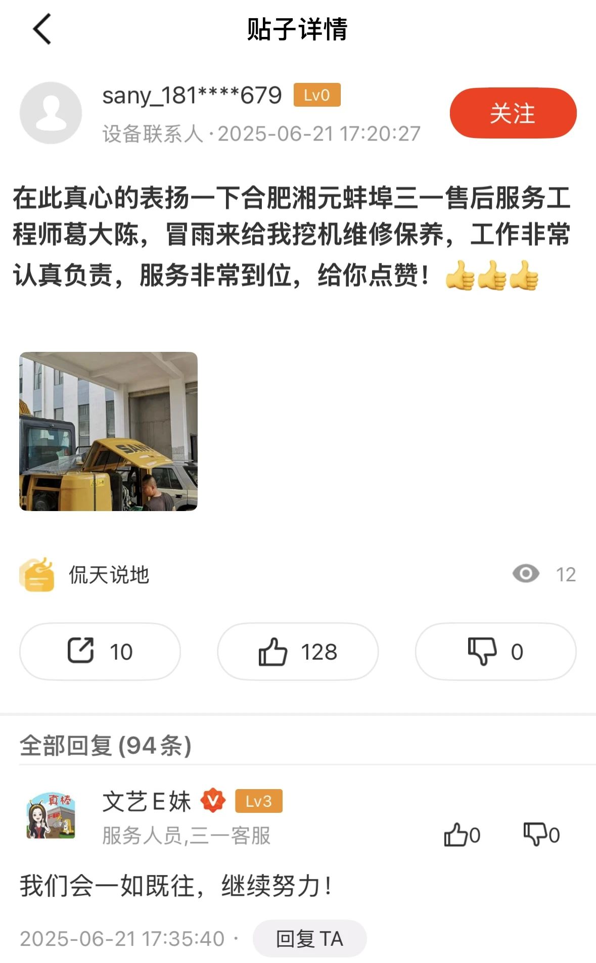 故障排除,空调恢复清凉,设备运行如常。客户王先生看在眼里,感动在心。他在激动之余,特意通过易维讯平台发表表扬帖:一句质朴的“给你点赞”,是客户对葛大陈专业能力和敬业精神的最大认可,更是对三一服务品质的高度褒奖。