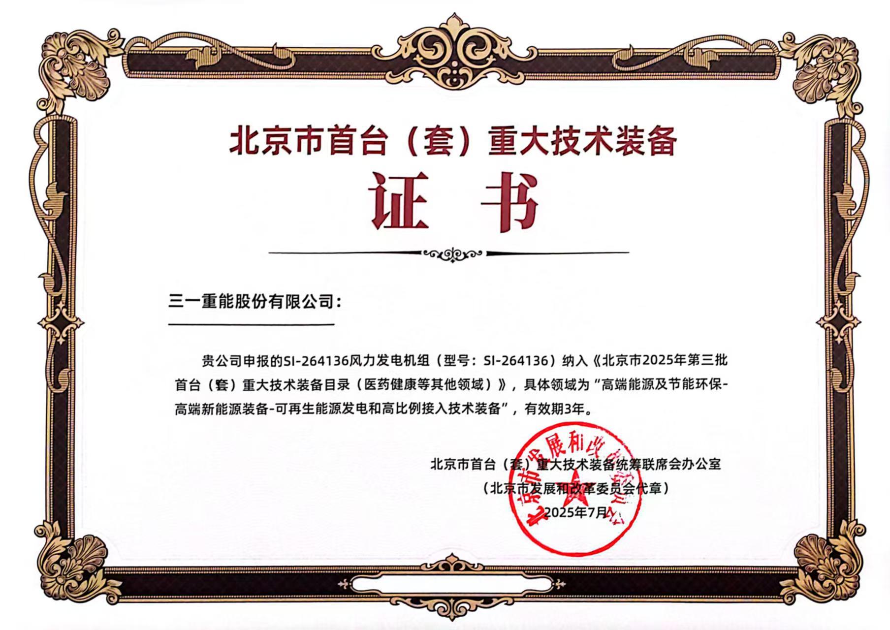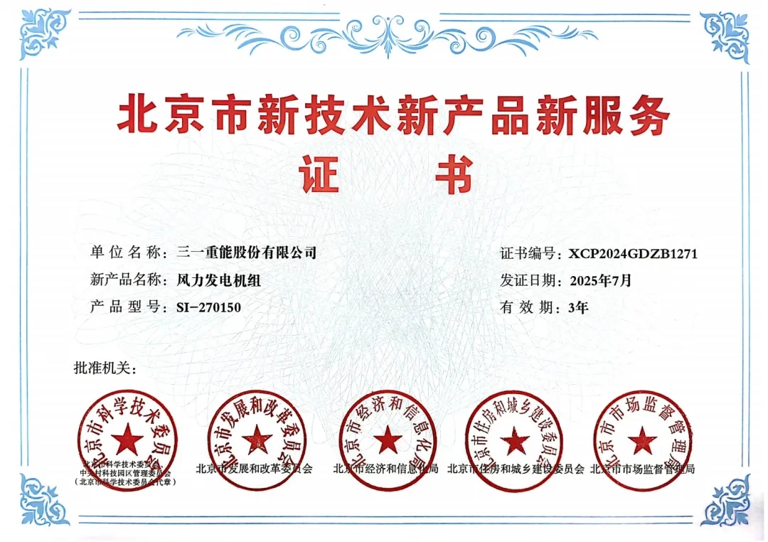当中国风电逐渐走入技术“无人区”,三一重能敢为人先,以全产业链的协同创新、全生命周期的深度验证,为风电行业的发展先行探路,成为国内最早一批推动10MW级以上风电机组立项设计、样机下线、订单转换的整机商。此次获得北京市两项重磅认证,既是对三一重能前瞻性战略布局的充分肯定,也是对其探索创新能力的高度认可。