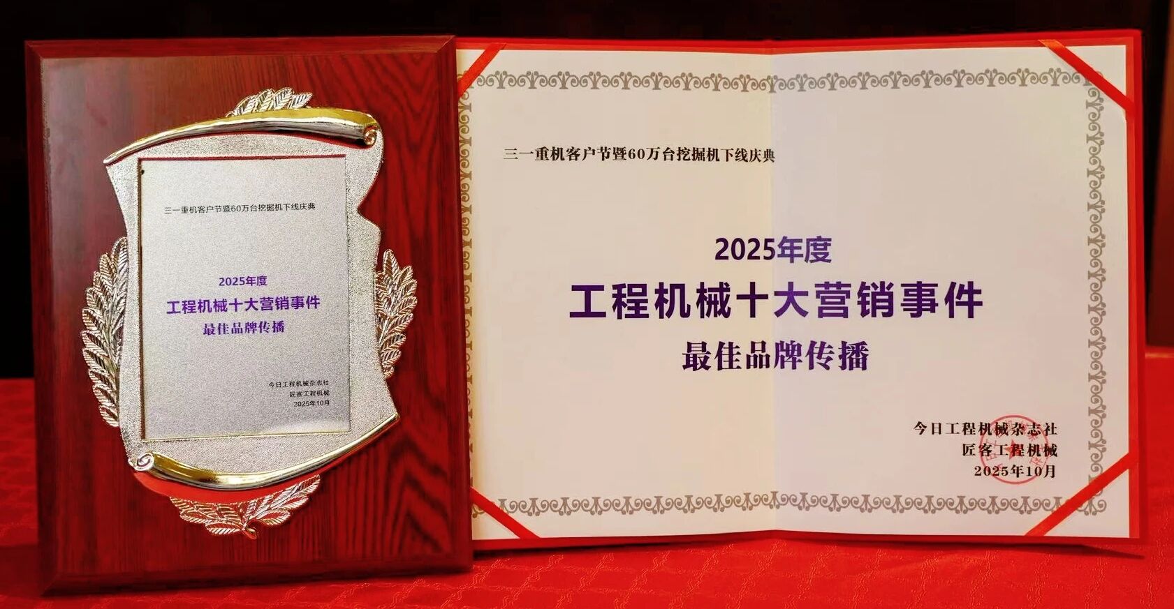 2025年10月22日,“2025年度工程机械十大营销事件”在江苏常州重磅发布。“三一重机客户节暨60万台挖掘机下线庆典”荣登“2025年度工程机械最佳品牌传播事件”。
