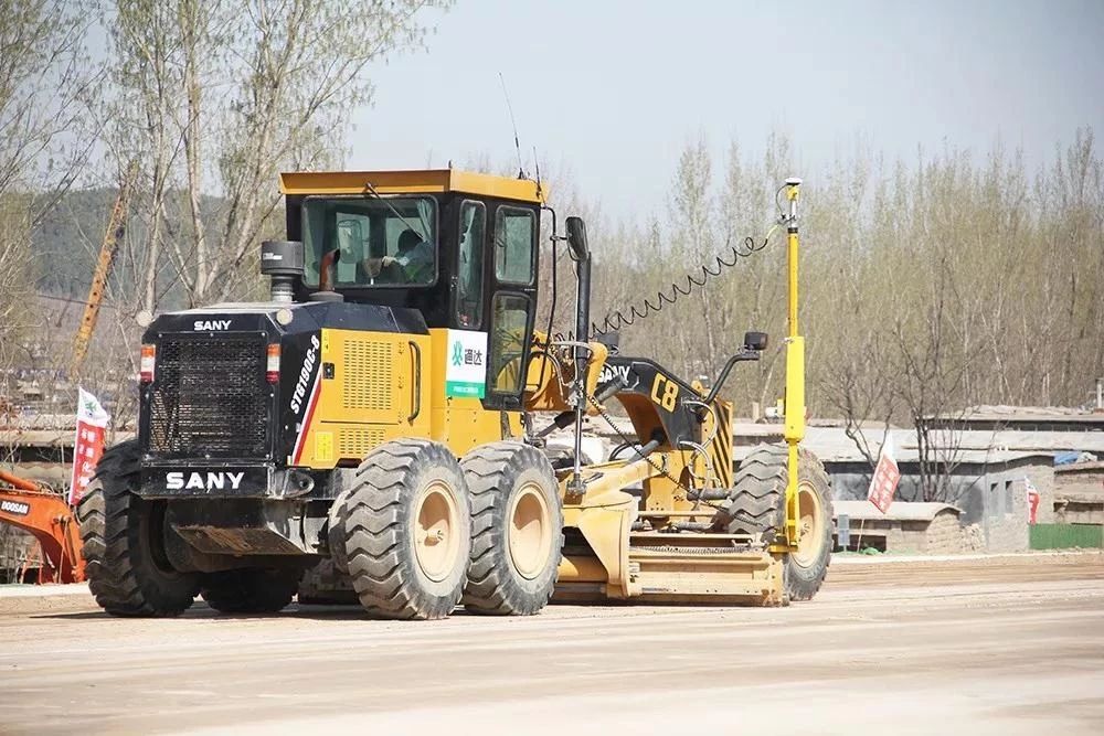 施工观摩会现场,搭载摩巴3D智能找平系统的三一STG190C-8平地机在卫星GPS精准定位下展开工作,自动提取预先输入系统的路面高程等信息。