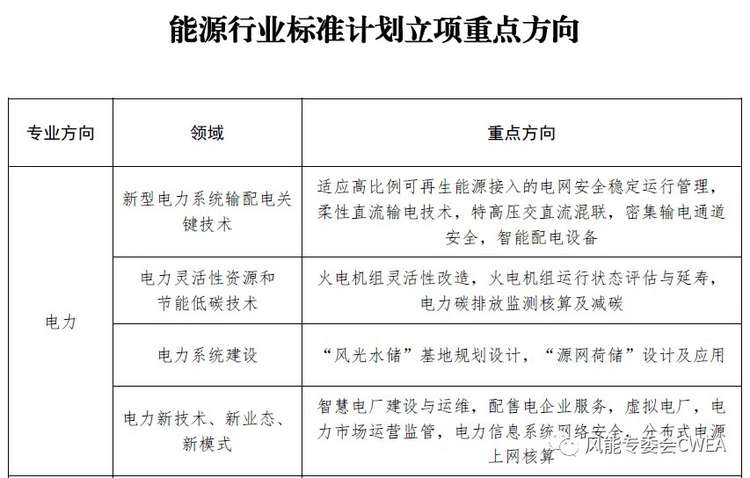 2022年1月20日,国家能源局综合司发布关于《2022年能源行业标准计划立项指南》的通知提出:新能源和可再生能源专业方向之“风能”行业标准方向包括风电节能降碳与安全管理,风电场改造升级,风电设备退役循环利用,风电机组关键零部件四大类列入能源行业标准计划立项重点方向。另外,立项指南还列出了新型储能和氢能关键技术和电力相关输配电关键技术、节能低碳技术和电力新模式等。