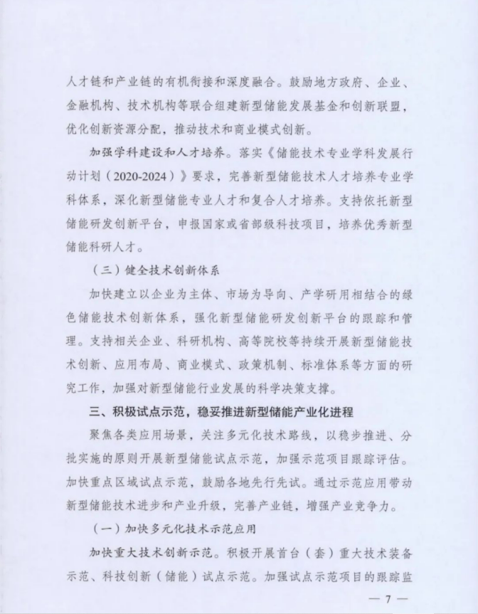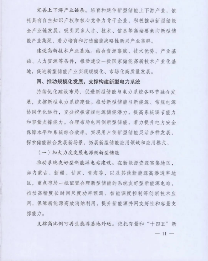 方案要求:持续优化建设布局,促进新型储能与电力系统各环节融合发展,支撑新型电力系统建设。推动新型储能与新能源、常规电源协同优化运行,充分挖掘常规电源储能潜力,提高系统调节能力和容量支撑能力。合理布局电网侧新型储能,着力提升电力安全保障水平和系统综合效率。实现用户侧新型储能灵活多样发展。探索储能融合发展新场景,拓展新型储能应用领域和应用模式。