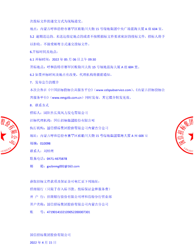 近日,包头市固阳县40万千瓦风电基地项目(标段一)EPC招标公告发布。根据公告,包头市固阳县40万千瓦风电基地项目位于内蒙古自治区包头市固阳县境内。风电场拟采用80台单机容量5.0MW的风电机组布置方案,其中西部场区布置32台,容量160MW,东部场区布置48台,容量240MW,整个场区总容量400MW,新建220kV升压站一座,新建220KV送出线路一回。