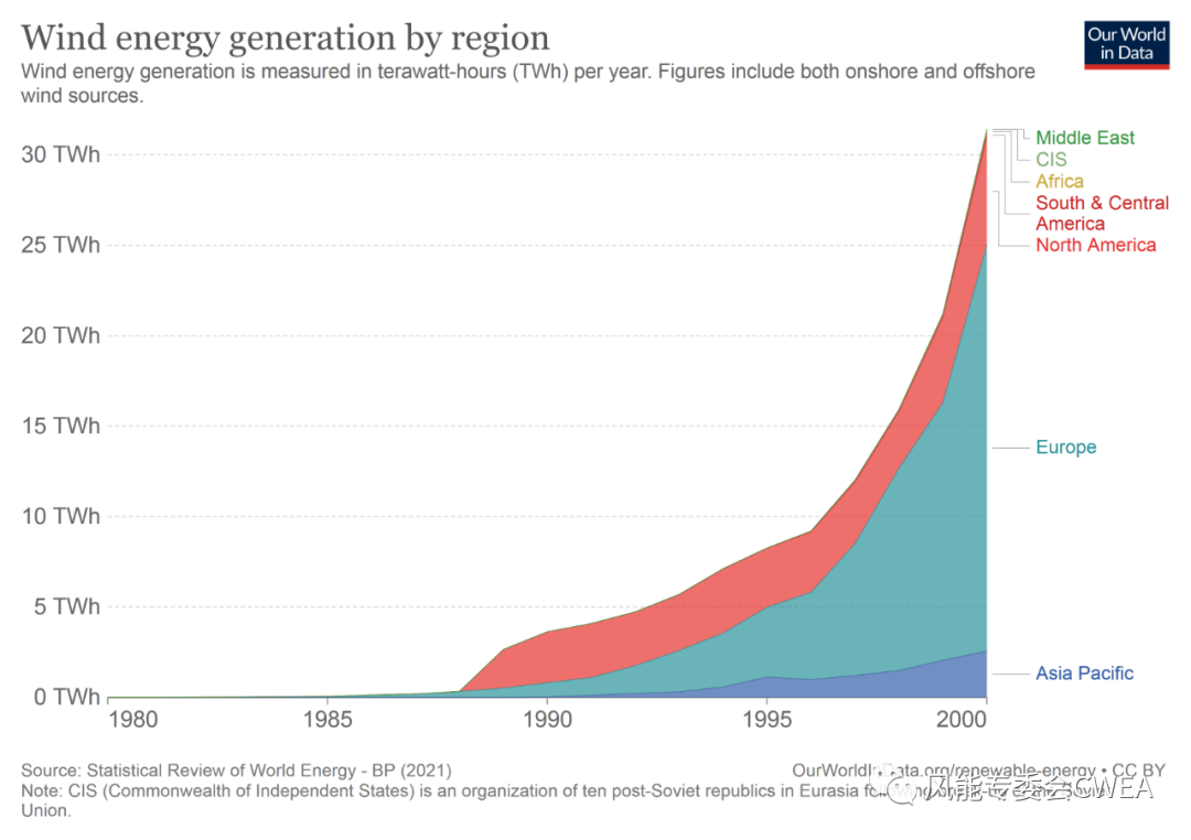 1980年至2000区间:数据显示,1980年至1990年,风能发电量全球不超过5TWh,其中以美国为主的北美风力发电量占主要,超过80%;自1990年开始,欧洲在技术和政策双重推动下快速攀升,至1995年已超越北美。亚太地区,到1995年数据还不大,直到2000年,整个亚太地区所占的份额还非常低,增长缓慢,总发电量不超过2.5TWh。
