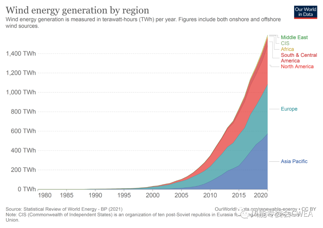 1980年至2020年区间:全球风能发电量的快速增长情况。可以看出,自2015年前后开始,亚太地区风力发电量快速攀升,开始超越欧洲和北美。这一年,中国风电开始更快速发展,占据超过1/3的全球装机量,带动亚太地区风能发电量的快速增长。从“微不足道”到“举足轻重”。