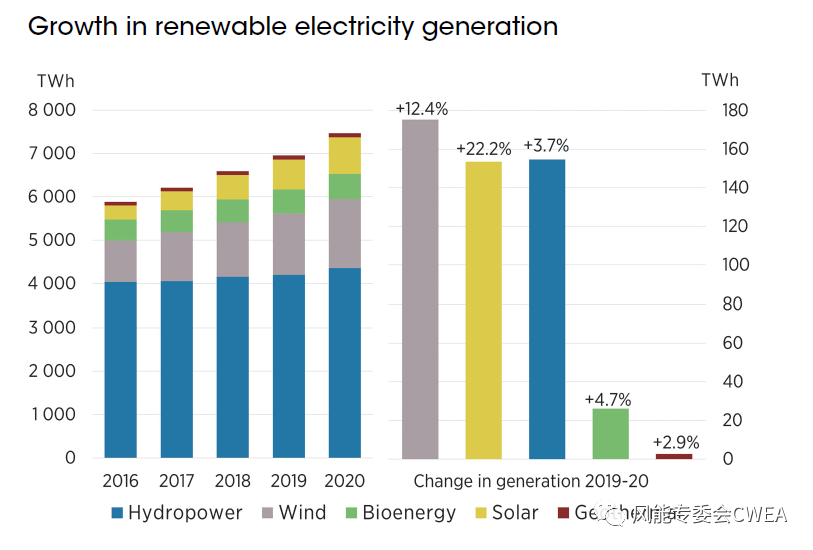 2020 年太阳能和风能发电分别增长 22% 和 12%。这两种能源共同继续主导可再生能源发电的增长,占自 2016 年以来增长的 73%。水力发电的增长迅速,2020 年增长了两倍(+155 TWh,而 2019 年为 +48 TWh)。