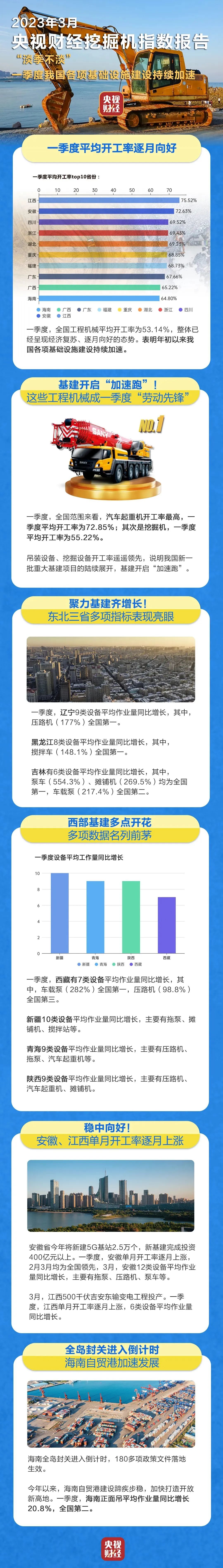挖掘机是基础设施建设的“标配”,是反映基础设施建设、观察固定资产投资等经济变化的风向标。央视财经与三一重工、树根互联联合打造的“央视财经挖掘机指数”发布了最新相关数据。一季度原本是基建开工的传统淡季,今年在多项政策的支持下,一批补短板、强功能、利长远、惠民生的重大项目有序实施,基建投资呈现“淡季不淡”的态势。