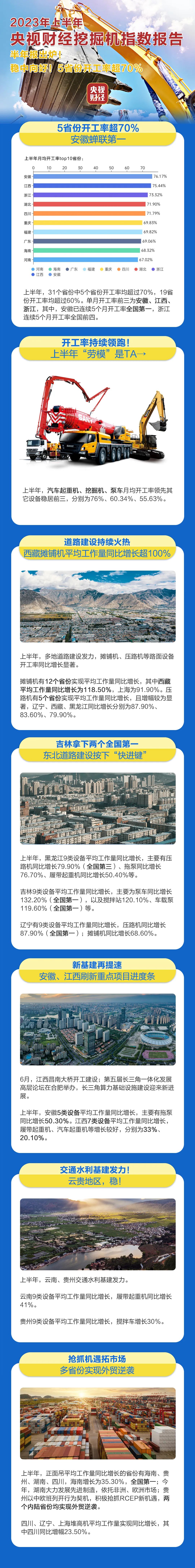 挖掘机是基础设施建设的“标配”,是反映基础设施建设、观察固定资产投资等经济变化的风向标。央视财经与三一重工、树根互联联合打造的“央视财经挖掘机指数”发布了最新相关数据。今年上半年我国各地重大项目扎实推进,稳步推进经济高质量发展,多个省份成绩亮眼。