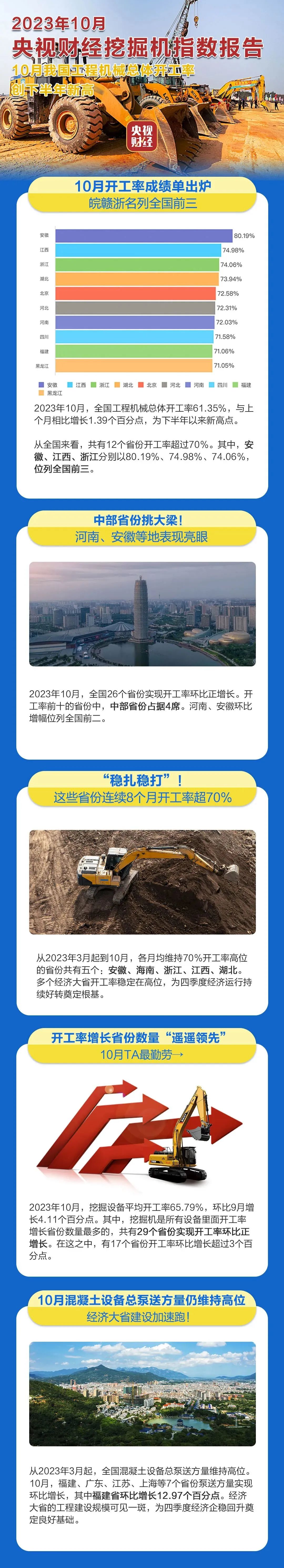 挖掘机是基础设施建设的“标配”,是反映基础设施建设、观察固定资产投资等经济变化的风向标。央视财经与三一重工、树根互联联合打造的“央视财经挖掘机指数”发布了最新相关数据。10月我国工程机械总体开工率61.35%,创下半年新高。我国各项基础设施建设加速,多组数据展现中国经济澎湃动能,高质量发展稳步推进。