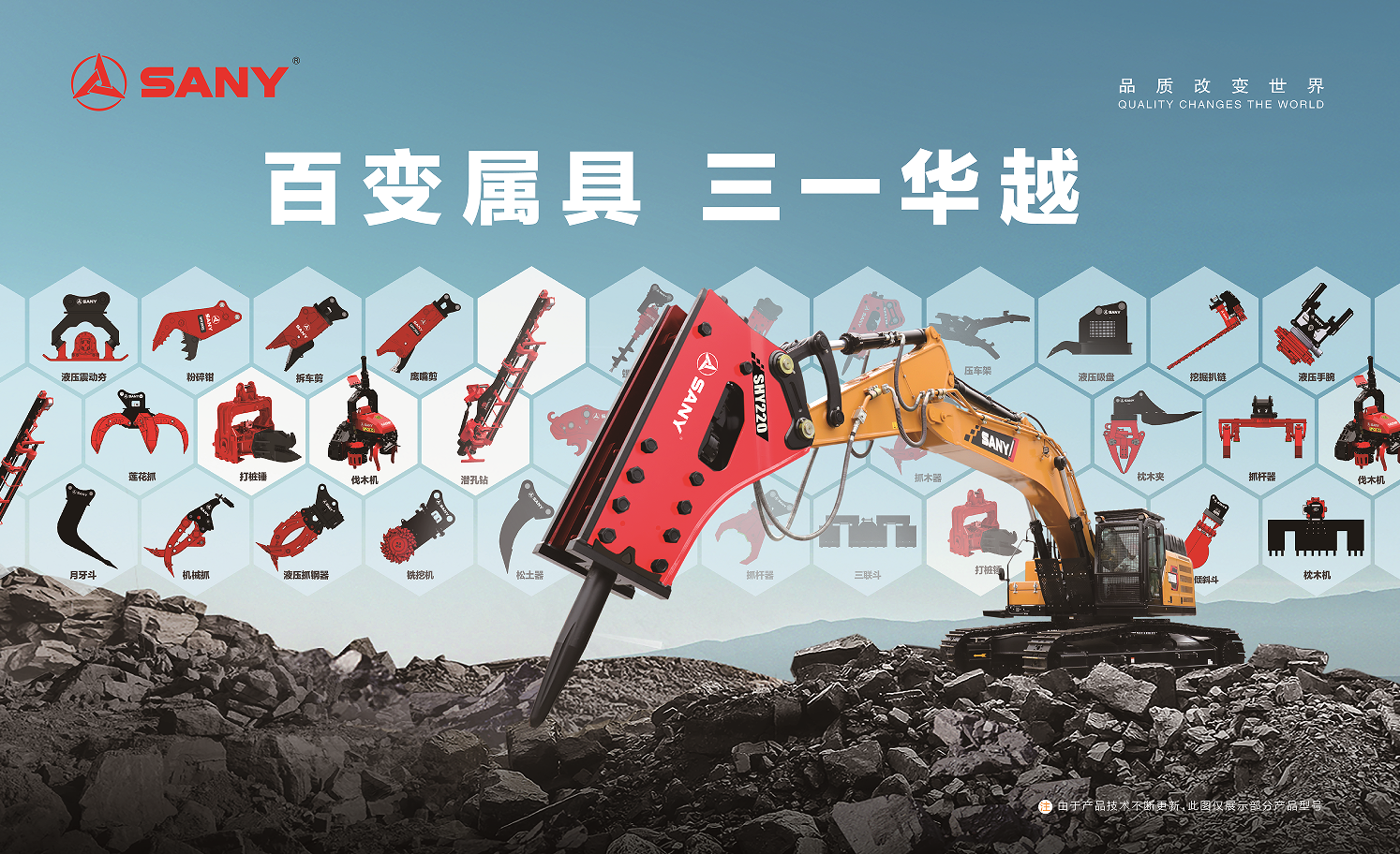 无论是抓钢器、电磁吸盘、鹰嘴剪、拆车剪等金属再生领域专用属具,还是拆迁剪、破碎锤、粉碎钳等拆迁施工领域专用属具,或是枕木夹、卸煤机、筛分斗等铁路施工领域属具,以及市政园林施工领域中常见的震动夯、打桩机、螺旋钻机、松土机、移树机等多样化属具产品,三一重机深入场景、创新研发、坚持品控,以客户第一的服务态度,致力于提供专业的解决方案。