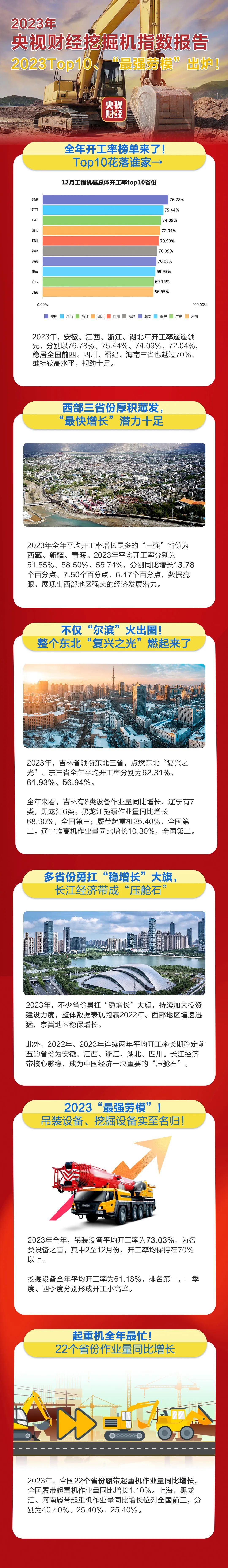 挖掘机是基础设施建设的“标配”,是反映基础设施建设、观察固定资产投资等经济变化的风向标。央视财经与三一重工、树根互联联合打造的“央视财经挖掘机指数”发布了最新相关数据。2023年全国工程机械开工率为58.57%,各项基础设施建设稳中向好,不少省份勇扛“稳增长”大旗,整体数据表现跑赢2022年。